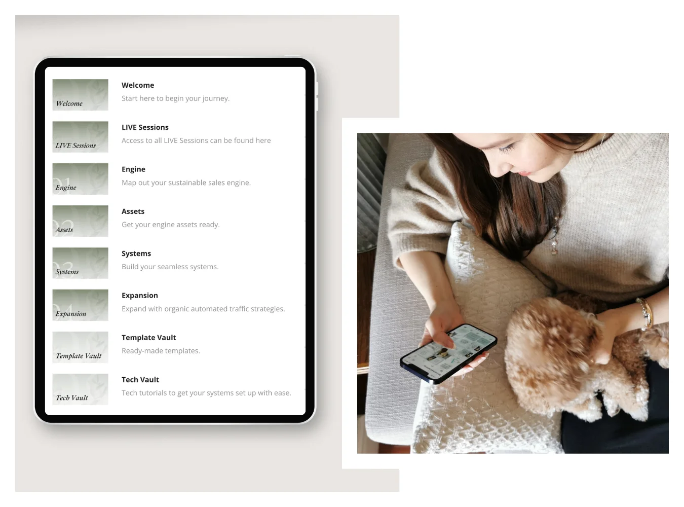 - Assets that articulate your work and value on repeat – so that you can stop doing daily sales calls, constant live webinars and updating all your systems every time you want to launch again.